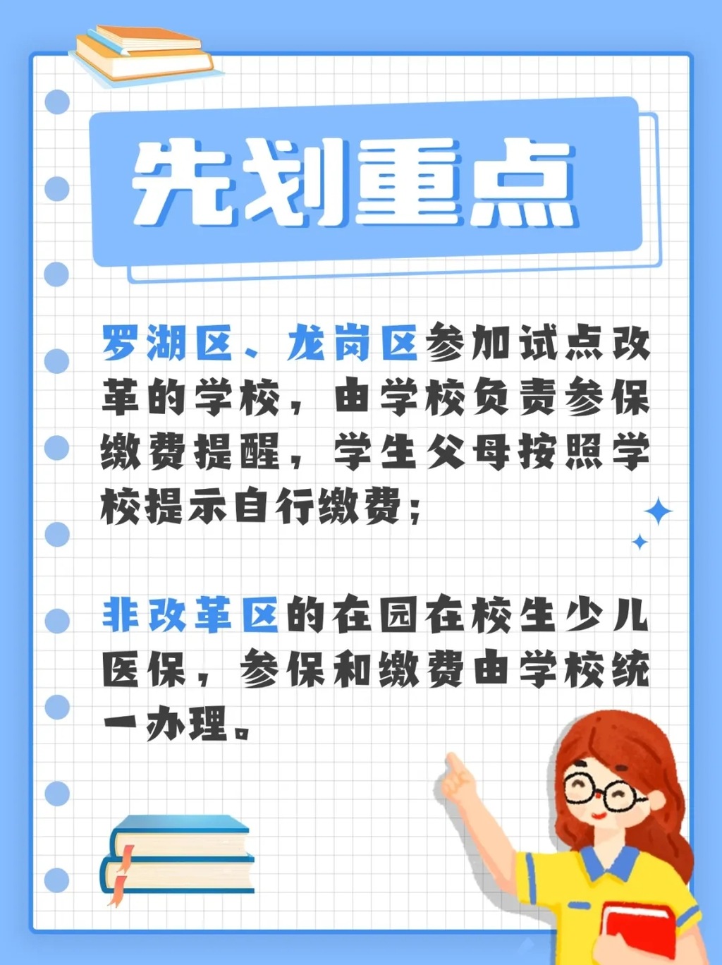 3.2024-2025學年度,羅湖區、龍崗區試點改革(采用“直征入庫”方式),參加試點改革的學校,由學校負責參保繳費提醒,學生父母按照學校提示自行繳費。