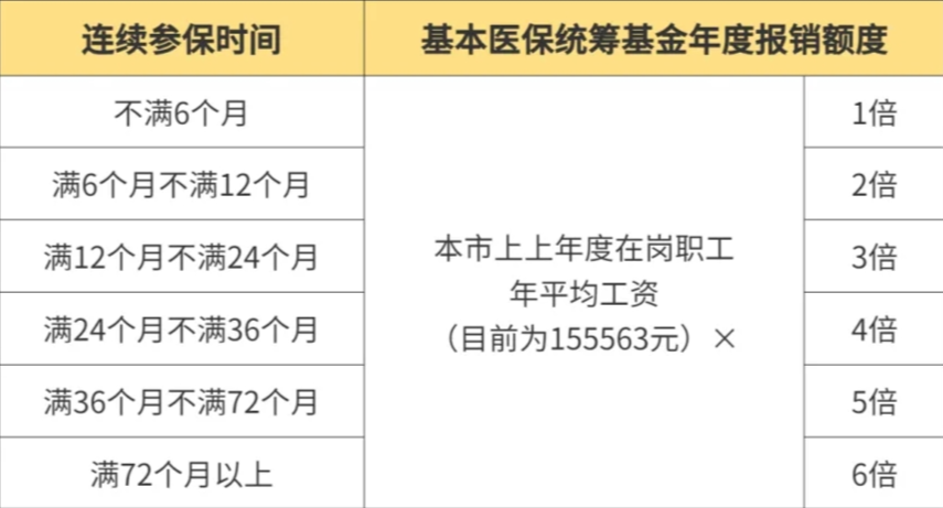 注:上面提到的基本醫保統籌基金年度報銷額度與參保人連續參加基本醫保的時間掛鉤。